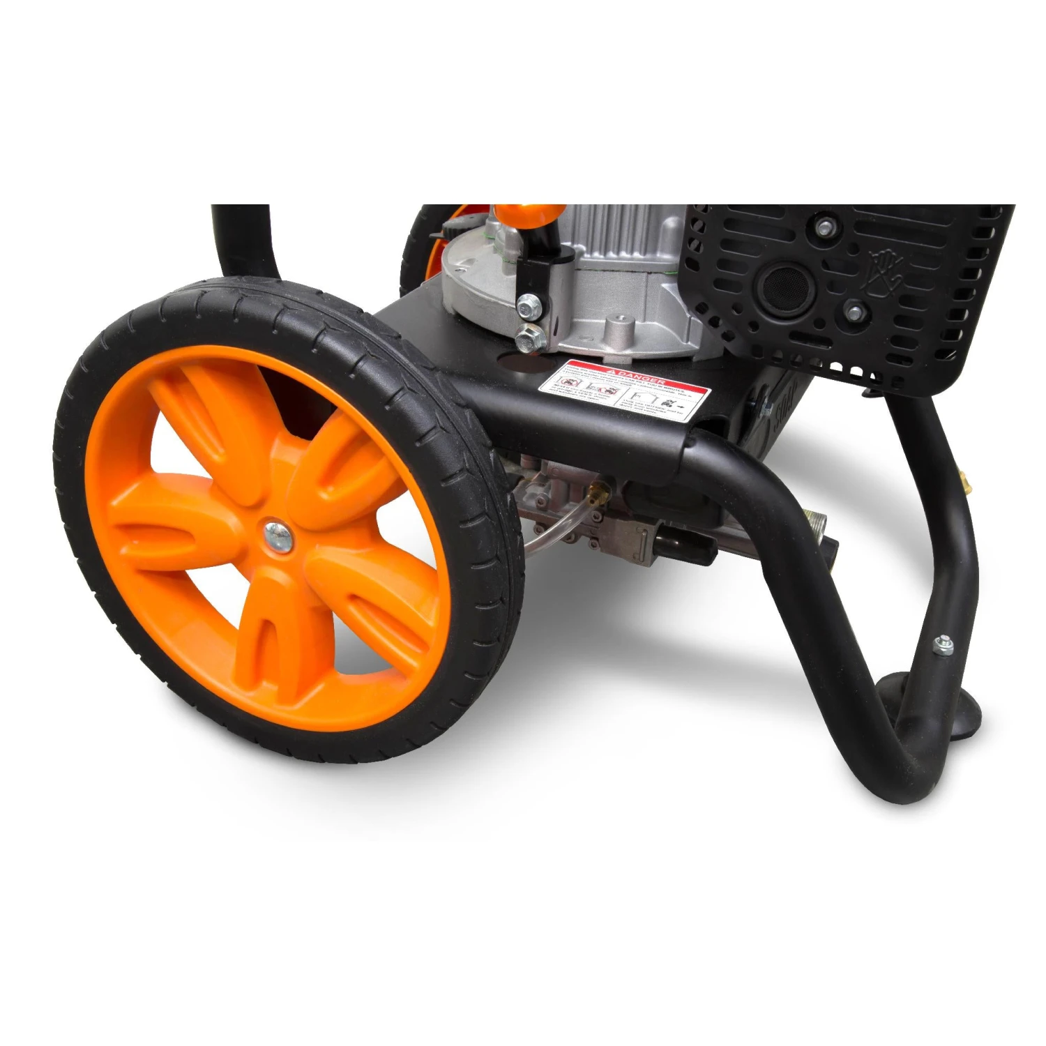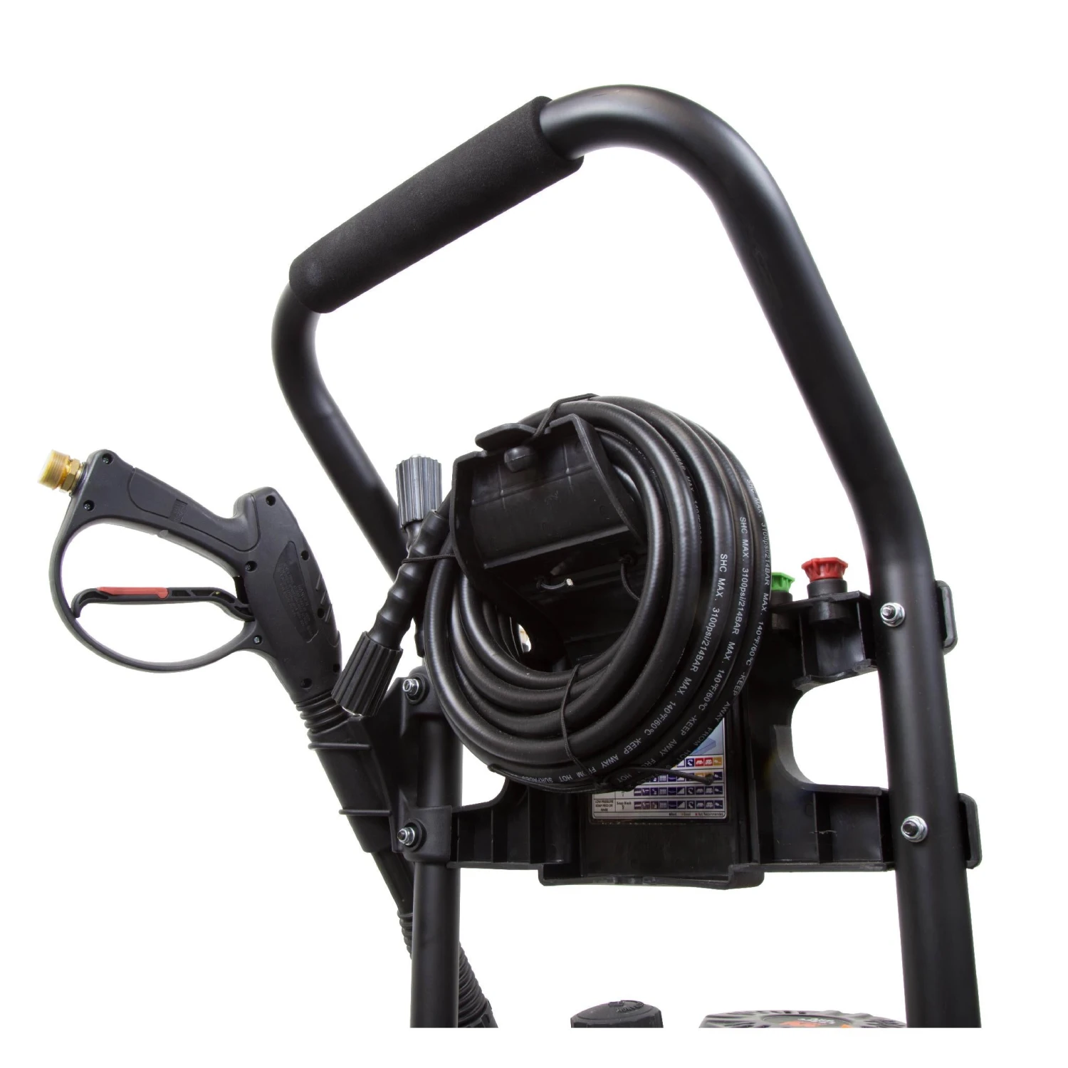 - Includes a 25-foot reinforced hose, an onboard soap tank, a quick-connect spray gun, and a two-year warranty