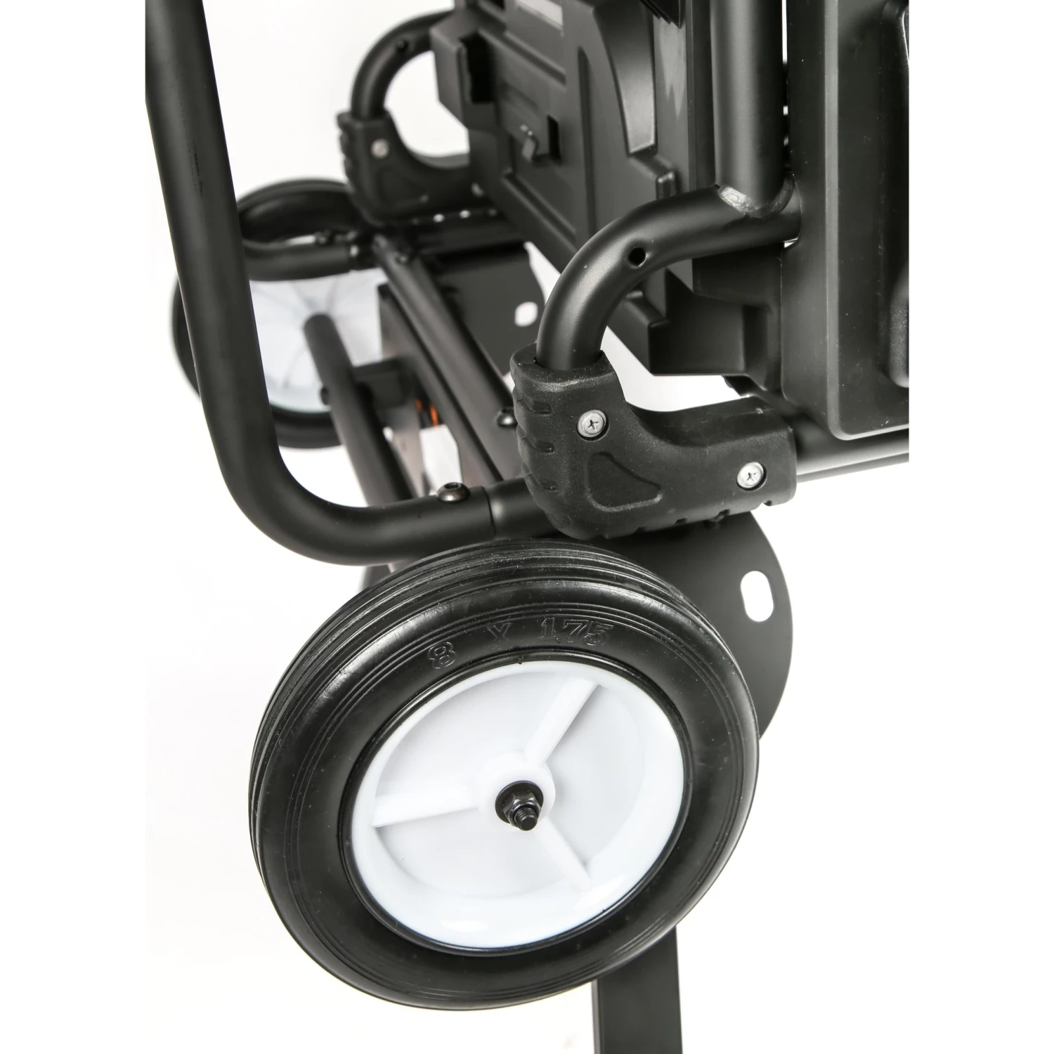 - Stand features foldable legs, two 7.5-inch never-flat wheels, and a 32-by-34-inch footprint