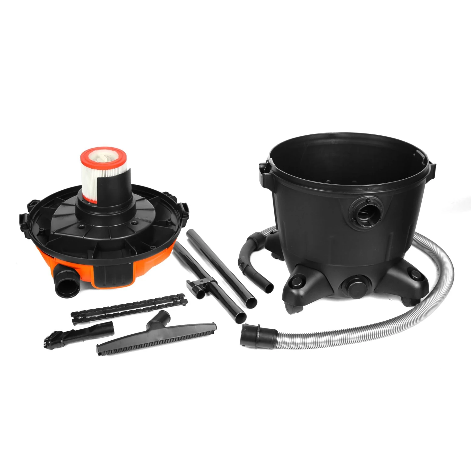 - Includes a 10-amp motor with 6.5 peak horsepower, a 5-foot dust hose, two extension tubes, a 9.25-gallon tank, a crevice nozzle, a floor brush with attachments for both wet floor and carpet, and a two-year warranty